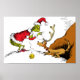 This hilarious illustration captures the precise moment the Grinch decides his dog needs an upgrade! The Grinch, dressed in his full, fuzzy Santa suit, is meticulously tying a single reindeer antler onto the head of his dog, Max, using a piece of string or yarn. Poor Max looks utterly resigned to his fate as the "reluctant reindeer." This fun, classic illustration perfectly highlights the absurd and mischievous planning behind the famous Christmas heist!