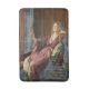 This design features a painting by the British Pre-Raphaelite artist John Collier (1850–1934). It depicts an elegant young woman seated in an interior space that conveys both comfort and quiet luxury. She leans slightly back, her posture relaxed yet slightly provocative, suggesting a degree of playful self-awareness. One of her arms rests casually against her own shoulder, while the other holds a small mirror, hinting at themes of vanity and reflection. Her gaze is directed either at herself or just beyond, leaving her exact thoughts ambiguous and inviting the viewer to speculate on her intentions. The woman is dressed in a flowing gown of soft, warm tones, with a sash tied at her waist, which enhances the graceful contours of her figure. Her long, wavy hair cascades loosely around her shoulders, adding a romantic, Pre-Raphaelite softness to her appearance. Light falls gently on her face and upper body, illuminating her features and drawing attention to the subtle expression that balances innocence with flirtation. The warm, intimate atmosphere, combined with the careful rendering of fabrics and textures, creates a scene that is both aesthetically pleasing and psychologically intriguing. The Minx belongs to the genre of “problem pictures”, in which Collier and other Victorian painters deliberately left narrative elements ambiguous to provoke thought and moral reflection. The woman’s expression and gesture suggest multiple readings: she could be admiring her own beauty, scheming, or subtly asserting her charm and independence. The title, The Minx, reinforces this sense of playful mischief or flirtation, reflecting late-Victorian fascination with femininity, desire and the power of self-awareness.
