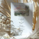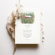 This two-sided wedding invitation features a charming watercolor illustration of a The Pallet Barn nestled in lush Christmas trees. Loose ink outlines define the wooden structure, while soft washes of evergreen, sepia, and muted gold capture the texture of the trees and the surrounding landscape. On the front, a scenic country lane lined with fencing leads the eye toward the barn under a dreamy pastel sunset sky, creating a romantic sense of arrival and place.