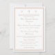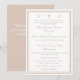 Design front features a pure white background to elegant, pale-pink text displayed in the proper format for a traditional Catholic wedding invitation. The image of a cross is displayed at top center between the initials of bride and groom. Entire design is framed by a fine, elegant border which adds a classy appearance to the design.