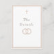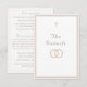 Design front features a pure white background to elegant, pale-pink heading displayed in center. The image of an elegant cross graces the top, as the image of joined wedding rings appears below heading. Entire design is framed by a fine, elegant border which adds a classy appearance to the design. Reverse features text displayed in the proper format for a traditional Catholic enclosure card which includes reception information, accommodations information. Bridal registry information is featured at bottom.