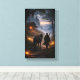A lone traveler leads his horse through the misty forest toward a small cabin glowing in the distance. Lanterns light the path like silent guides, while mountains fade into the evening haze. This artwork captures a moment of calm after a long journey — a place that feels like shelter, memory, and home all at once. It speaks about solitude, endurance, and the quiet hope found at the end of the road.