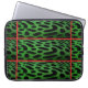 Green and black leopard skin laptop sleeve, with red stripes, across and down.