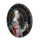 A modern twist of a young woman in an elegant red gown with a sheer shawl holds a bouquet of flowers, surprised by the unexpected arrival of blue butterflies that flutter around her. Her curly hair frames her face, and she wears a pearl necklace.