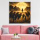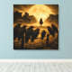 A haunting second chapter in the Gothic Western series. As a lone cowboy approaches a silent frontier town under a massive, textured moon, a line of ravens with glowing eyes keeps watch from a barbed-wire fence. This square canvas is rendered with a heavy, weathered burlap grain, providing a rugged and antique textile aesthetic. The high-contrast amber glow and deep shadows create a suspenseful, supernatural atmosphere for any rustic or modern space.