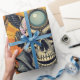 The winged skull. This steampunk-style skull captivates with its intricate details and complex decorations. The skull is artfully decorated with finely crafted gears, screws, and metallic patterns, giving it an industrial yet elegant character. The upper part of the head features elegant wings reminiscent of Victorian wings made of delicate metal.