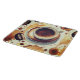 The art was created digitally using special computer software, it is a unique look to this glass cutting board. In the center there is a cup with coffee in it then there are coffee beans around it and finally there ate wild coffee stains.