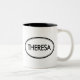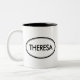 Kontrollera ut denna Theresa mugg! Är ditt namn Theresa? Eller har du en fru, en flickvän, en kvinnlig familjemedlem eller en kvinnlig vän som namnges Theresa? Om så, är denna mugg "för det kända frimärket" exakt gåvan som du söker efter! Designen presenterar "Theresa" i stor svart bokstäver som omges av två ovaler, en som är tunn, och en som är tjock.