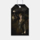 Thin female carrying a lamp and a bone through woods at night, with a dog as a companion.