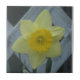 Single Daffodil in full bloom in front of white lattice.