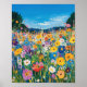 This vibrant painting depicts a field of wildflowers under a bright blue sky. Featuring daisies, poppies, and other blooms in shades of orange, pink, red, blue, and white, the artwork captures a lush, lively scene. The clear sky with fluffy white clouds adds depth, while the impressionistic style with bold brushstrokes and vivid colors evokes a cheerful, sunny day. Perfect for brightening up any room with a touch of nature.