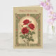 Three deep-red roses rise from a single stem. Two blooms are fully open; a third flower is partially unfurled, and a small tight bud perches above them, promising another bloom. The flowers sit against an intricate circular repeating swirling motifs.