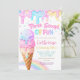 Featuring glitter-style watercolor ice cream scoops, dripping pastel rainbow colors, and playful confetti sprinkles, this invitation brings sweet party magic to life.