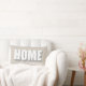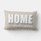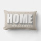 Personalized modern minimalist lumbar pillow with the family name for example and bold Home quote typography, with cool shadow relief effect. Neutral warm beige background, white and gray for the sans serif text, easy to match in any ambient. Premium look, scandinavian simple chic for your home decor or as a creative gift for newlyweds or as housewarming gift, or new homeowners present. Great custom gift idea under 50 dollars. Also excellent item to use when staging a house for selling, as cozy classy decorating to make the home more attractive and inviting.