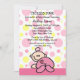 Rosa Trendig Flicka Baby Shower-inbjudan. Med en vidsträckt krympande flicka med en polka med streckad bakgrund för rosa och gult. Du är inbjuden, tack vare klistermärken och frimärke. ©Jdsclipart