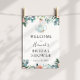 Det är dags för te med den blivande bruden! Välkomna gäster till er bröllopsdusch med denna vackra affisch, med en akvarellvit tekanna omgiven av grönska, eukalyptus och rosa blommor. Anpassa med din information eller klicka "Klicka för att anpassa ytterligare" för att redigera typsnitt, storlek och färger.
