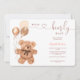 Tur vismisk illustration av nallen och med neutralt guld-ballonger för babyduschinbjudan med ett typsnitt av eleganten som säger att vi kan vänta tidigt. Perfekt könsneutral babydusch.