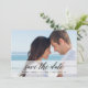 Stilren save the date fotoannonsering med en genomskinlig vit banner med elegant modern kalligrafi skrift som säger "Save the Date".