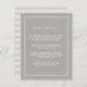 Elegant och enkel, detta lilla kort i neutral gråbeige nyans låter dig dela viktig information med dina bröllopsgäster. Kortet är designat för att matcha vår tidlösa brölloppskollektion och har en vit geometrisk ram och klassisk bokstavsstil med seriffer. Undrar du vilken information du bör ta med på ett bröllopsinbjudningsbilaga? Överväg detaljer som hotellboende, gruppkoder, transport, vägbeskrivningar, välkomstreception och webbadressen till din brölloppswebbplats. Du kan till och med ladda upp en karta på baksidan med hjälp av anpassningsfunktionen.