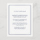 Elegant och enkel, detta lilla kort i marinblått och vitt låter dig dela viktig information med dina gäster. Kortet är designat för att matcha vår tidlösa brölloppskollektion och har en marinblå geometrisk ram och klassisk bokstavsstil med seriffer. Undrar du vilken information du bör ta med på ett bröllopsinbjudningsbilaga? Överväg detaljer som hotellboende, gruppkoder, transport, vägbeskrivningar, välkomstreception och webbadressen till din brölloppswebbplats. Du kan till och med ladda upp en karta på baksidan med hjälp av anpassningsfunktionen.