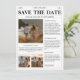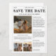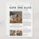 Meddela din speciella dag i ett tidlöst redaktionellt stil med den här tidningsinspirerade tidningen för vintage att spara datumet. Det här kortet är perfekt för målbröllop och firande i kustnära kustområden med romantiska solnedgångar och en layout som visar tre personliga foton. En lysande blandning av klassisk design och minimalistisk elegans. Det är ett prisvärt men minnesvärt sätt att din kärlek-historia med vänner och familj.
