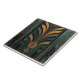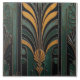 Art Deco stil-panel med symmetrisk blommigt, med en central stiliserad blomma i guld och grönt, uppbyggd av geometriskt mönster och lodrät pub, som alla ställs mot en mörk grönt bakgrund med en åldras, texturerad avsluta.