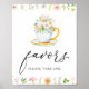 Favoritskylt med en illustration av vildblommor, grönska och tekopp med ordet "favors" i ett roligt kalligrafiskrift.