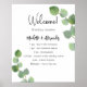 En modern elegant, bröllopsprogram, tidslinje. Vit bakgrund, dekorerad med eukalyptus greenery, spriggar. Anpassa och lägg till information om namn och bröllop. Svart färgad brev. Om du har mer text kan du minska radavståndet.