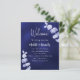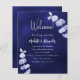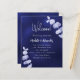 En modern elegant, bröllopsprogram, tidslinje. En marin blå bakgrund, dekorerad med eukalyptus, sprickor. Den blå färg är ojämn. Anpassa och lägg till information om namn och bröllop. Om du har mer text kan du minska radavståndet. Du kan också lägga till text på baksidan. 1 lakan = 1 program tryckt kant till kant.