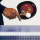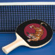 dekorativa teckningar av en stor, randig, stekande tiger som korsar en stor röd cirkel på en pingpongpaddel.