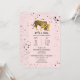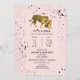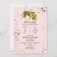 En inbjudan till babydusch med en illustration av en tiger för baby och mamma omgiven av svart stänk över ljus rosa bakgrund.