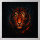 En djärv digital konst från en tigers ansikte som brinner genom en storm av brand och elenergi, blandar råstyrka och ljusstyrka i en mörk surrealistisk atmosfär.