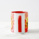 Cat art by Patricia Villa. Mug with yellow tiger cat oj whimsical red designs background. Very bright and colorful with lottsa red. Cute