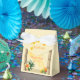 En grafisk design av Tropical Luau Hawaiian Party Tiki Hut av artist/designer Charmaine Paulson på partifavör box. Rutan innehåller textmallar för din anpassning. ©2014 charmainepaulson