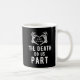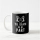 Bröllop mugg för nylingarna med citatet "Til death do we part" och skelett händer utgör ett hjärta. Svart party favors med ett redigerbart datum och initialer från bruden och brudgummen. Se till att besöka vår samling för att se fler samordningsobjekt som matchar den här designen för din speciella händelse.
