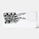 En djärv och edgy illustration av ett skeletthandtag som bildar ett fredstecken, inlindad i ett vintage med texten "FORTFARANDE DÖD, JAG ÄR BRA". Den här monokroma teckningen ger ett rebeljöst meddelande om lugn, där man blandar gotisk estetik med en coola och en bakåtriktad attityd.
