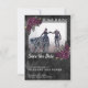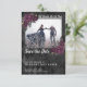Spara datumkortet med "Död", "mörk lila ro" och en svart bakgrund i mönster. Skripttypografi. Anpassa med ditt eget foto.