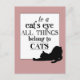 Den här roliga, söta designen lyder: "Till kattens öga tillhör all sak katter" i en mängd typsnitt. Uttrycket är ett briljant ordspråk. Det finns en silhuett av en katt som sträcker sig vid ord. Utformningen är vit mot färgadens bakgrund eller med en kvadratisk panel bakom ord. I båda caseserna kan färg enkelt bytas ut mot bakgrund. De här roliga kattcitaten finns på ett stort antal produkter, bland annat anteckningsblock, klistermärken, knappar, påsar och t-shirts, och gör underbara presenter/presenter/treats för kattälskare och kattägare, eller som tack för kattkennlar/katterier. Alla bakgrundsinställningar i färg är lätta att anpassa efter dina egna önskemål.