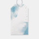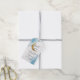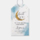Dreamys födelsedagsfest-favorittagg med vattenfärgen struktur i blått på baksidan med faux guld glitter måne och stjärnor. I texten står det: "Tack till måne och tillbaka."