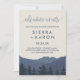 Denna reträtt till bergen äventyr väntar på att datumkortet ska vara perfekt för ett modernt målbröllop. Utformningen har ett bergsområde med en blå serenblått vattenfärg med en skog av evergreen träd i förgrunden.