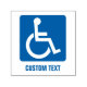 Hjälpskylt. Rullstolssymbol. Stiliserad vit person på en rullstol. Blå bakgrund. Anpassningsbar.
