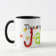 En vit ringsignal mugg av bra med svart fälg och handtag. Konstruktionen är ett handmålat pappert kollage med namn Jacob i stort brev sprinklat med stjärnor. Dishwasher och mikrovågsugn säker. Se även matcha gratulationskort och presenter.