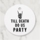 Presentkortsetiketter för bridal shower med tema 'Tills döden skiljer oss åt'. Festartiklar med en skelett-hand i svart och vitt för en gotisk, heavy metal eller rockparty. Coola dekorationer att lägga till presentförpackningar och påsar.