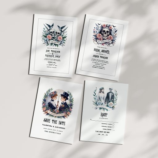 Omfamna skönheten i en evig kärlek med "Till döden skiljer oss åt" bröllopsinbjudan, en slående blandning av gotisk romantik, vintage-tatuering och eleganta blommor. Med handritade dödskallar, svalor, korslagda dolkar och mjuka rosor är denna inbjudan perfekt för par som älskar alternativa, gotiska eller Halloween-inspirerade bröllop. Med helt anpassningsbara inbjudningar, tackkort, skyltar och mer, sätter denna samling tonen för en mörkt romantisk och oförglömlig fest. Perfekt för dem som tror att sann kärlek varar bortom detta liv.