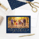 Den här eleganten firas det att jullottkort firar att det återigen finns nära och kära 2022! Utformningen kan vara helt personlig med ditt favoritlandskapsfoto, ett God jul (eller annat) hälsning, en familj namn och ett år. Har en djup blå bakgrund med ett subtilt målat struktur, faux guld-skript och ett cachelagrat fotoutrymme. En modern mönster med små guld-stjärnor klär upp baksidan av kortet.