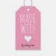 Rosa hänga upp märkre för dina handgjorda objekt där du kan lägga till ditt namn och tvätta instruktioner. Tillverkad med kärlek är skriven i ett stort handskrivet teckensnitt där ett doppat vitt hjärta ersätter ord kärlek. Ditt namn i ett charmerande svart skript.