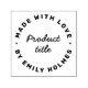 Enkel snyggt "tillverkad med kärlek" hememad eller handgjord frimärke för ditt småföretag eller hemmabruk eller bageriprodukter (t.ex. sylt, geléer, skorstenar eller andra hemgjorda varor tillverkade med kärlek). Utformningen har fet retroblock och handskriven typsnitt i svart. Texten i modern minimalistisk typografi kan lätt vara personlig med ditt eget ord, produktslag eller datum för en verkligt skräddarsydd text och en av en vänlig gåva eller konservering/produkt frimärke för ditt småföretag.