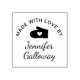 Den här personligen frimärke har böjd text som lyder "Made med kärlek by" ovanför ett ugnsfack med ett hjärta. Under den här texten skrivs bagarens namn i söt skript.