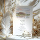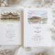 Clean, classic typography is centered beneath the artwork, leaving generous white space for a refined, gallery-print feel. The coordinating back continues the fine-art look with a closer architectural vignette of the venue above a “Finer Details” section, perfect for directions, schedule notes, transportation, or website information. All text is fully customizable, making this design ideal for rustic lodge, country club, estate, or lakeside weddings that want to highlight the beauty of their location in a timeless watercolor style.