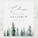 Elevate your wedding bar or favor table with this elegant wine label from the Timber Grove collection by Redwood & Vine Design Co. A row of watercolor pine trees stretches across the bottom, with a graceful script and serif combination above to showcase your names and wedding date. Perfect for outdoor weddings, winter lodge celebrations, or rustic vineyard receptions. Fully customizable to fit any event style.